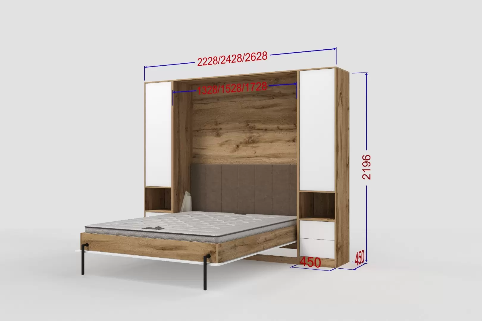 Дополнительные опции, такие как: освещение, зарядное устройство, розетки, мягкое изголовье, матрас - не входят в стоимость шкаф-кровати "Extra Start". Вы всегда можете их добавить в опциях или написав менеджеру при оформлении заказа.