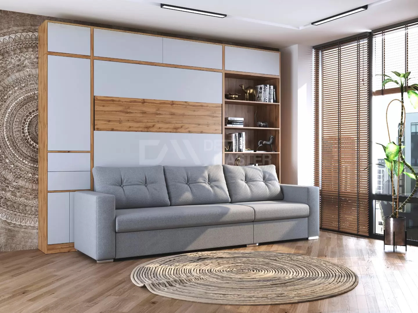 Шкаф-кровать трансформер с диваном "Urban Family Balance" работает на механизме раскладывания собственной разработки "Balance". Кровать раскладывается легким движением руки, превращаясь в полноценное спальное место. Просто потяните за ножку-маятник, которая самостоятельно фиксируется в нужное положение при опускании.