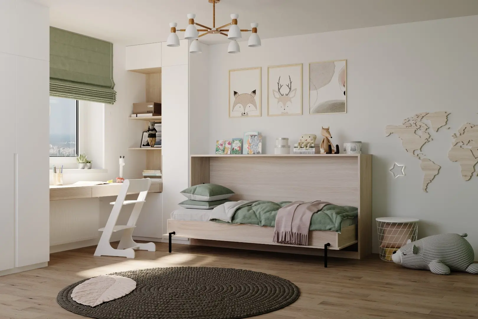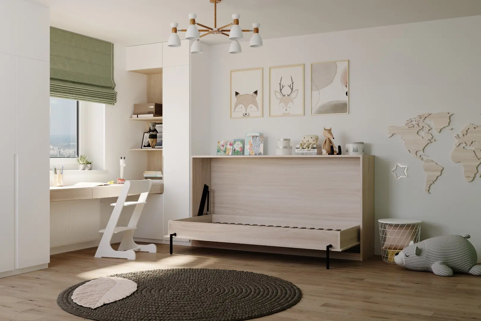 Детская горизонтальная шкаф-кровать "Little sleeper".  Работает на механизме раскладывания собственной разработки "Start". Кровать раскладывается легким движением руки, превращаясь в полноценное спальное место. Просто потяните ее за ручки, расположенные на фасаде и выставите ножки-опоры.